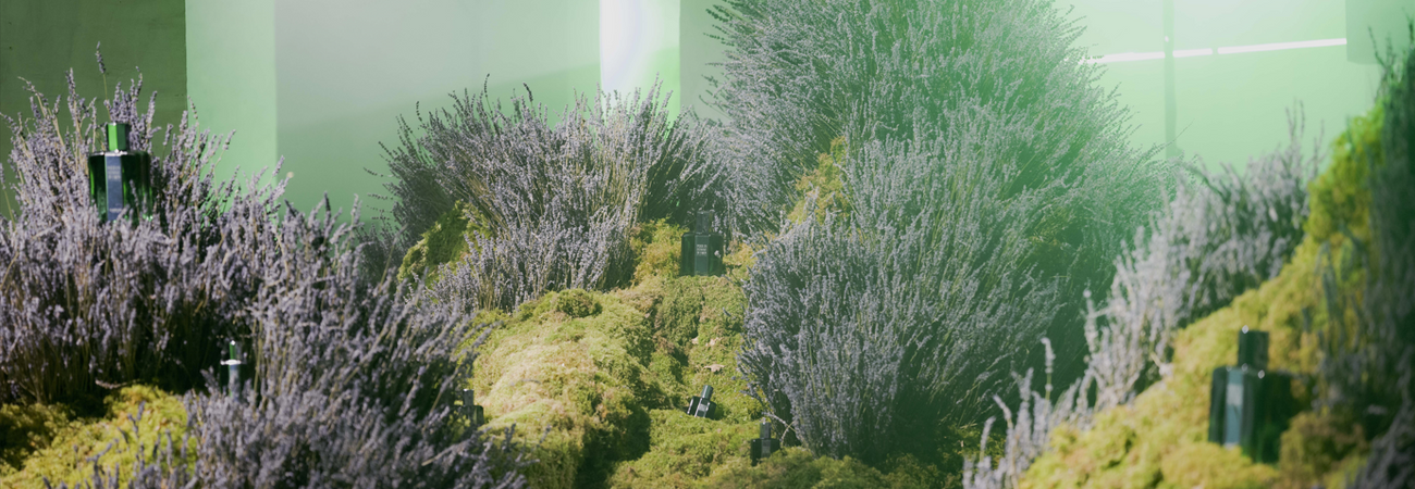 La Maison a imaginé un champs de lavande sur lequel était suspendu les différents parfums de la Trilogie formant un parcours olfactif contrasté. D'un côté, le flacon blanc du parfum matinal, symbole de sa fraîcheur. De l'autre, le flacon noir, symbole d'intensité, de sensualité et d'élégance.