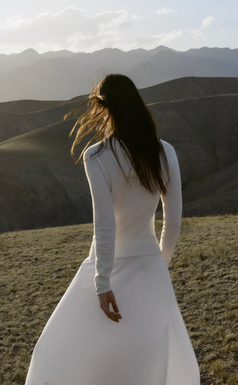 Olivia de Rothschild revendique l’audace comme héritage. Avec Atmah, elle imprime un nouvel élan à la Maison. Son imaginaire puise dans les paysages du Kirghizistan, au cœur de l’Asie centrale. Un territoire qui l’a profondément marquée. Là-bas, l’immensité des steppes, la clarté de l’air et l’ouverture des espaces, extérieurs comme intimes, éveillent un sentiment de liberté totale.
